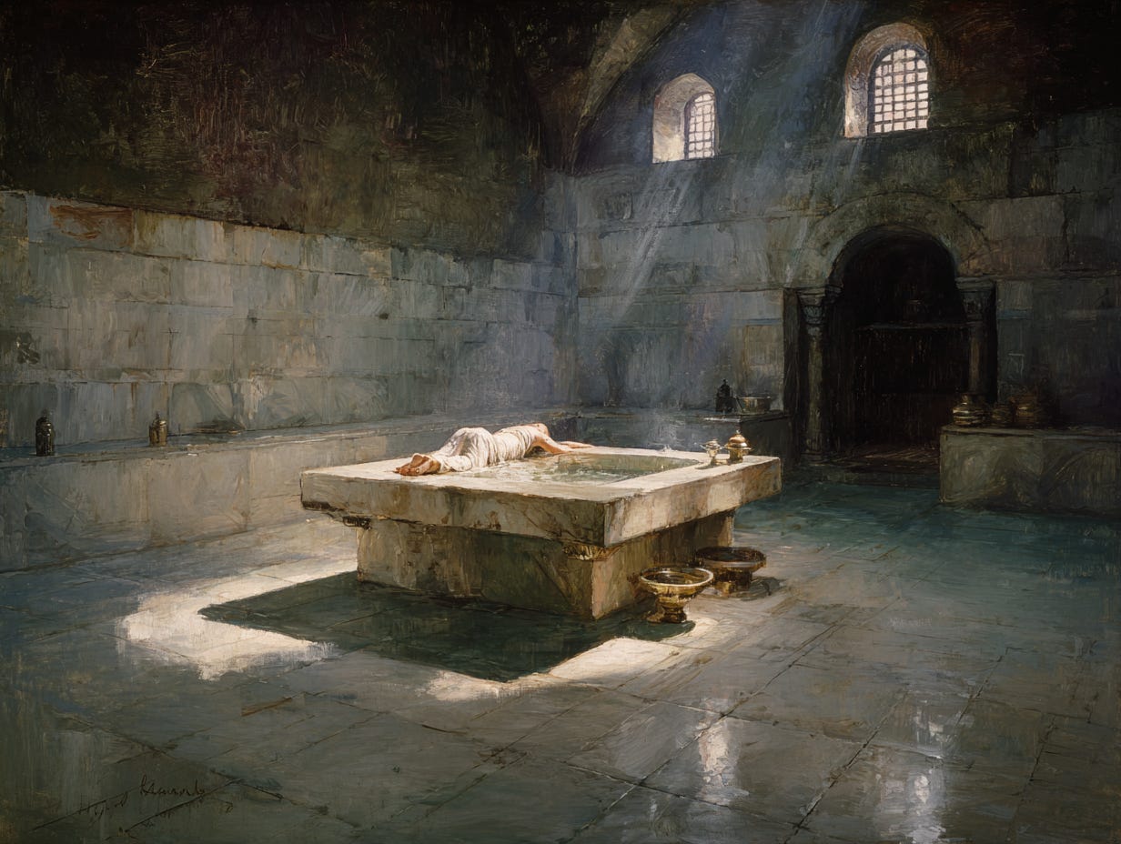 I lie naked on a great slab of marble and prepare to die. The stone table glows with its own heat, even in a room filled with steam. Morning sun slants down from high windows and glints off ornate basins and jugs of beaten copper.