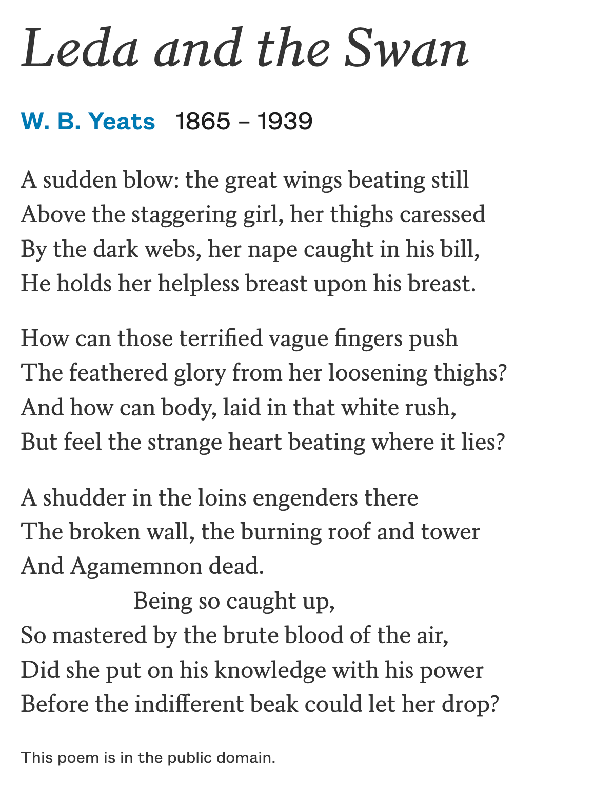 The last two lines have always haunted me; in the pattern of great romantic poetry, the meaning is more musical than literal. Did Leda absorb some of the god’s power and prophecy amidst her suffering? In life you can try to avoid pain, or you can accept is as inevitable and aim to gain empathy, insight and humility from it, emerge stronger and free of bitterness.
